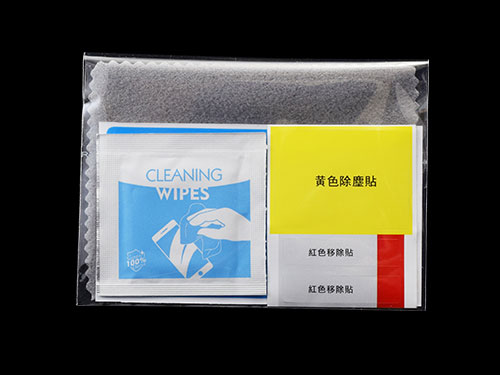 2、組合安裝配件包(擦拭布、酒精片、藍色除塵膜、黃色除塵貼、紅色除塵貼)